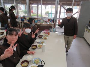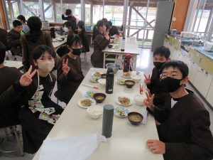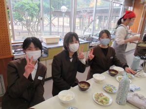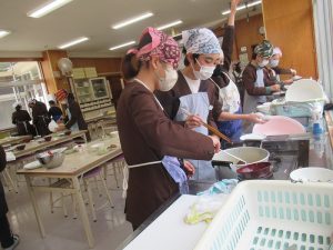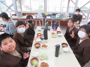 11月28日に調理実習を行いました。調理実習に向けて、家庭科の時間では、調理方法や使用する具材について話し合い、役割分担をして、スムーズに調理ができるよう、話したことをまとめたりしました。そのかいもあり、当日は手際よく調理を進めるだけでなく、空いた時間を有効に活用し、片づけも自分たちで率先して、行うことができていました。