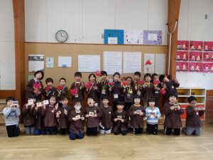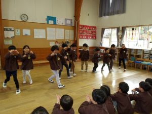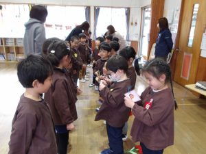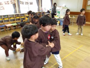 3月4日(水)に年少、年長組でお別れ会を行いました。子どもたちが決めたゲーム(椅子取り、ロンドン橋)を楽しみました。また、年長組がネズミのダンスを教えてくれたのでみんなで一緒に体を動かして踊りました。そのあとは、みんなでカルピスを飲みました。みんなで飲むカルピスはとても美味しく、おかわりもよくしていました。最後に年長組から年少組へ「一緒に遊んで楽しかったよ!」と、年少組から年長組へ「小学校へ行っても忘れないでね!」とメッセージを伝え、心を込めてプレゼントの渡し合いっこをしました。この1年間、お散歩やプール、水遊び、遠足や運動会など、毎日みんなでたくさん遊びました。年長組は、残りの園生活を楽しんで欲しいと思います。また、年少組は、今の年長組のように優しいお兄さんお姉さんになって欲しいと思います。