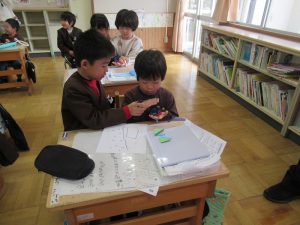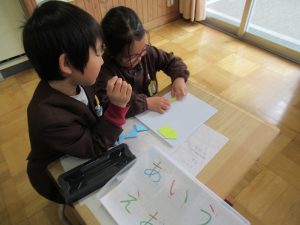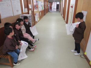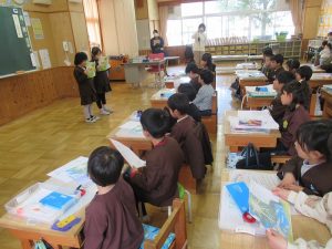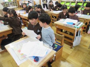4月に入学する幼稚園の年長組の友だちを招待して、「新しい1年生を迎える会」を行いました。1年生は、小学校の1年間の主な行事や様々な教室について、クイズ形式で分かりやすく紹介しました。また、ミニ授業として算数・国語・音楽の体験も行いました。1年生はお兄さん、お姉さんとして、幼稚園の友だちの手を引きながら優しく教える姿が見られました。最後には、一緒に折り紙を作り、楽しい時間を過ごしました。