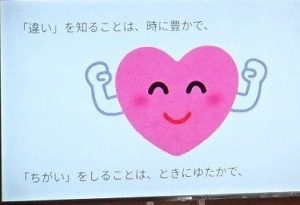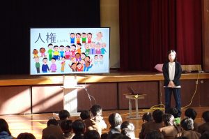 3月9日(月)の人権朝会では、担当教員から『あおいらくだ』という絵本の読み聞かせがありました。ある日、あおいらくだは、茶色いらくだに出会いました。茶色いらくだは言いました。「わたしが出会ったらくだとは全然違うね。あおくってなんだかへんてこだ」と。そこで、あおいらくだは、茶色いらくだに自分の知っている素敵な世界を見せようと思い誘いました。茶色いらくだは、思い切ってあおいらくだの世界に飛び込み、一緒にあおいらくだの中にある空や夜や海の素晴らしさを感じました。そこで茶色いらくだは、自分にはない世界の素晴らしさを知り心が躍りました。そして、お互いが知っている自分の素敵な世界を紹介し合いました。どちらも出会う前よりも豊かな気持ちになることができました。担当教員は、「違うことに勇気を持つことやみんながありのままの姿にOKを出せることで、たくさんの人にとって生きやすい社会が実現できますように…」と締めくくりました。