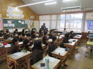 後半は、法務局から派遣された人権擁護委員の方のお話がありました。実際にネットで詐欺被害にあわれた方のお話や「困ったことがあったら、身近な大人や友だちに相談してください。」というお話がありました。とても大切なことを学ぶことができました。