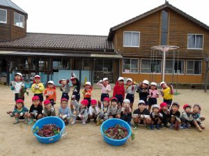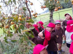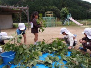 10月21日(火)は、黒枝豆と柿の収穫をしました。黒枝豆は、鞘が大きくプクプクとした豆がたくさん採れました。また、今年は幼稚園の柿の木にとても柿の実がたくさん出来ていて子どもたちも大喜びでした!!黒枝豆を湯がき、黒枝豆と柿をみんなで食べました。