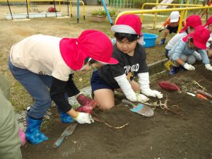 10月22日(水)には、さつまいも掘りをしました。畑の土が柔らかくて掘りやすく、子どもたちは宝さがしのように手で掘ってさつまいもを探していました。「あった!!」 「見て!!こんなに大きい!!」と楽しくさつまいも掘りが出来ました。 11月には、みんなで焼き芋を行う予定です。