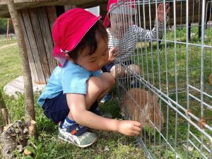 4月22日(火)みんなでアグリステーションへ遊びに行きました。先週、交通安全教室で学んだことを思い出しながら、車の確認や横断歩道などを歩きました。アグリステーションでは、遊具で遊んだり、ウサギやヤギの餌やりなど動物との触れ合いを楽しみました。室内では、ままごとや跳び箱、マット、ボルダリングをして遊びました。