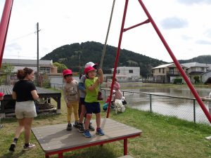 今日はたかしろ保育園と幼稚園で交流を行いました。前回は保育園に行って一緒に遊びました。今回は城南幼稚園に来てくれました。じゃんけん列車や魚釣りゲームをして楽しむことができました。
